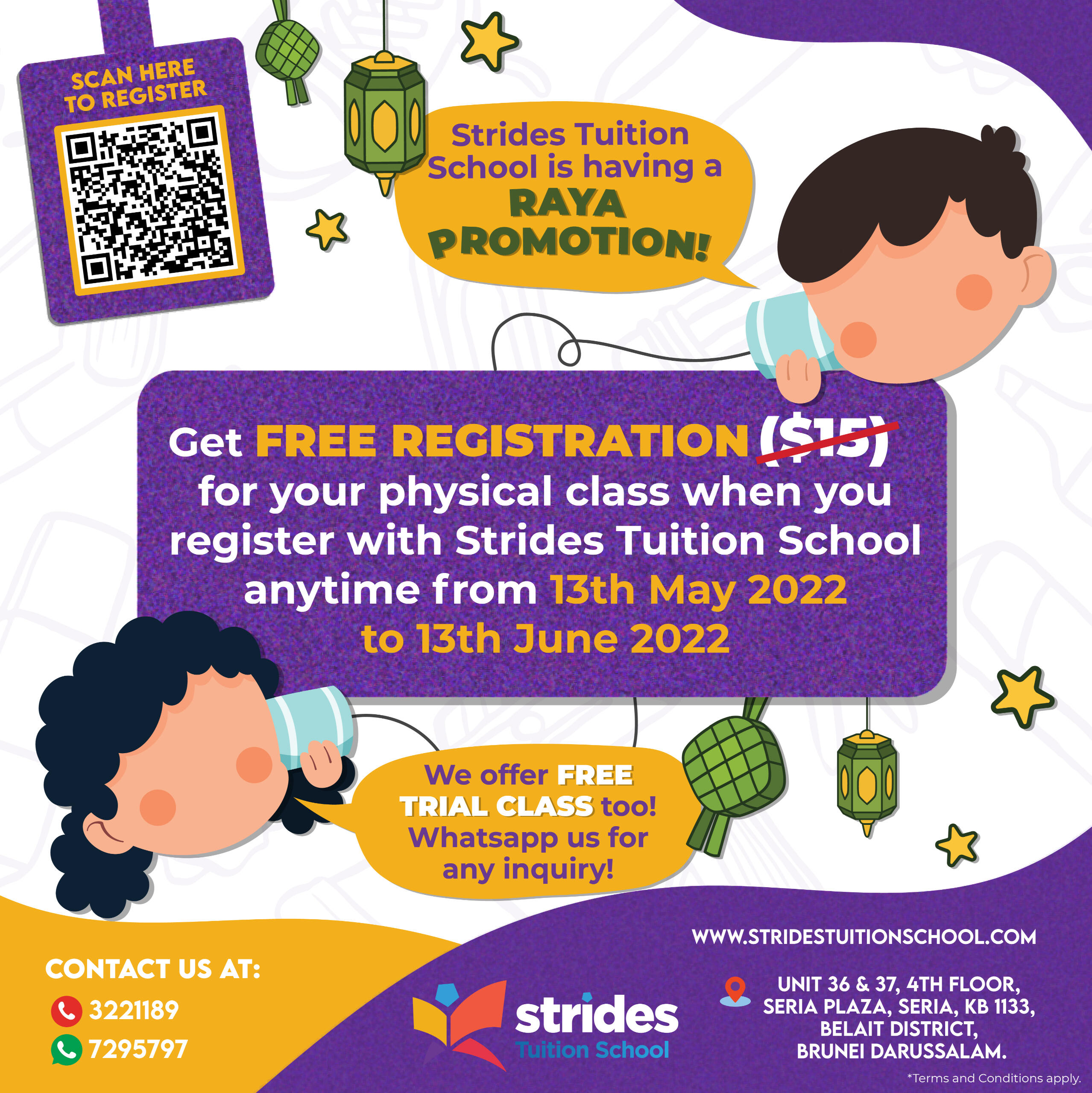 It’s that time of the year again! 🌛 We are back with a Raya Promotion - enjoy free registration when you register with Strides Tuition School anytime between 13th May 2022 up to 13th June 2022! 🌟