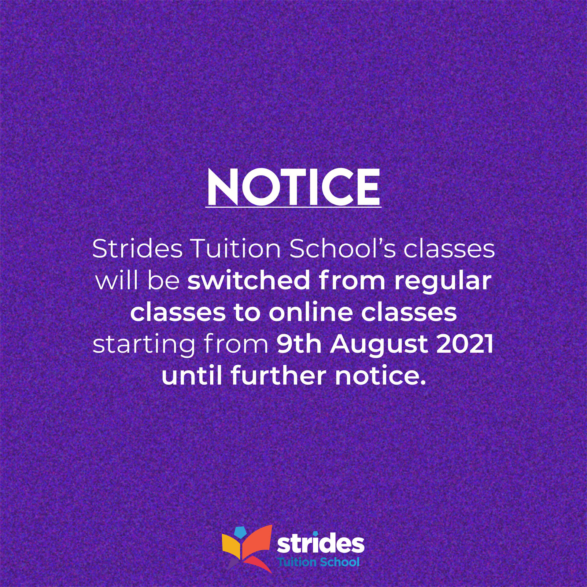 📢Dear parents and students, we would like to inform that Strides Tuition School will be working from home starting today until further notice in response to the increasing number of covid cases. For any inquiries, you may reach out to us via whatsapp or social media. Thank you for your understanding and we apologize for any inconvenience caused.