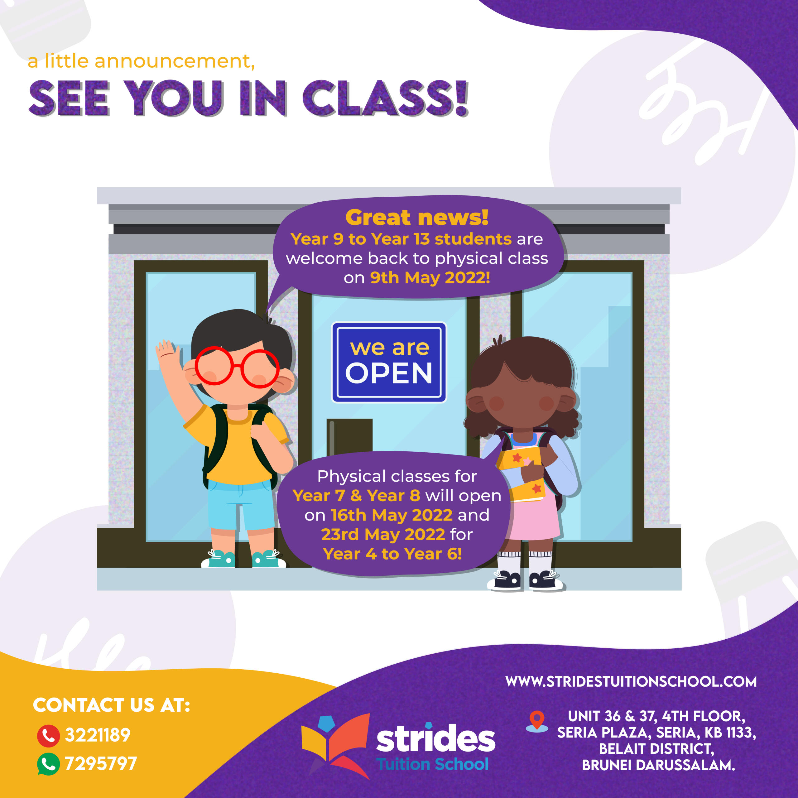 📢We’re super excited to announce that we’re re-opening physical class! Starting on 9th May 2022 with Year 9 to Year 13 students. 16th May 2022 for Year 7 and Year 8 students and lastly 23rd May 2022 for Year 4 up to Year 6 students! See you in class soon! 😆