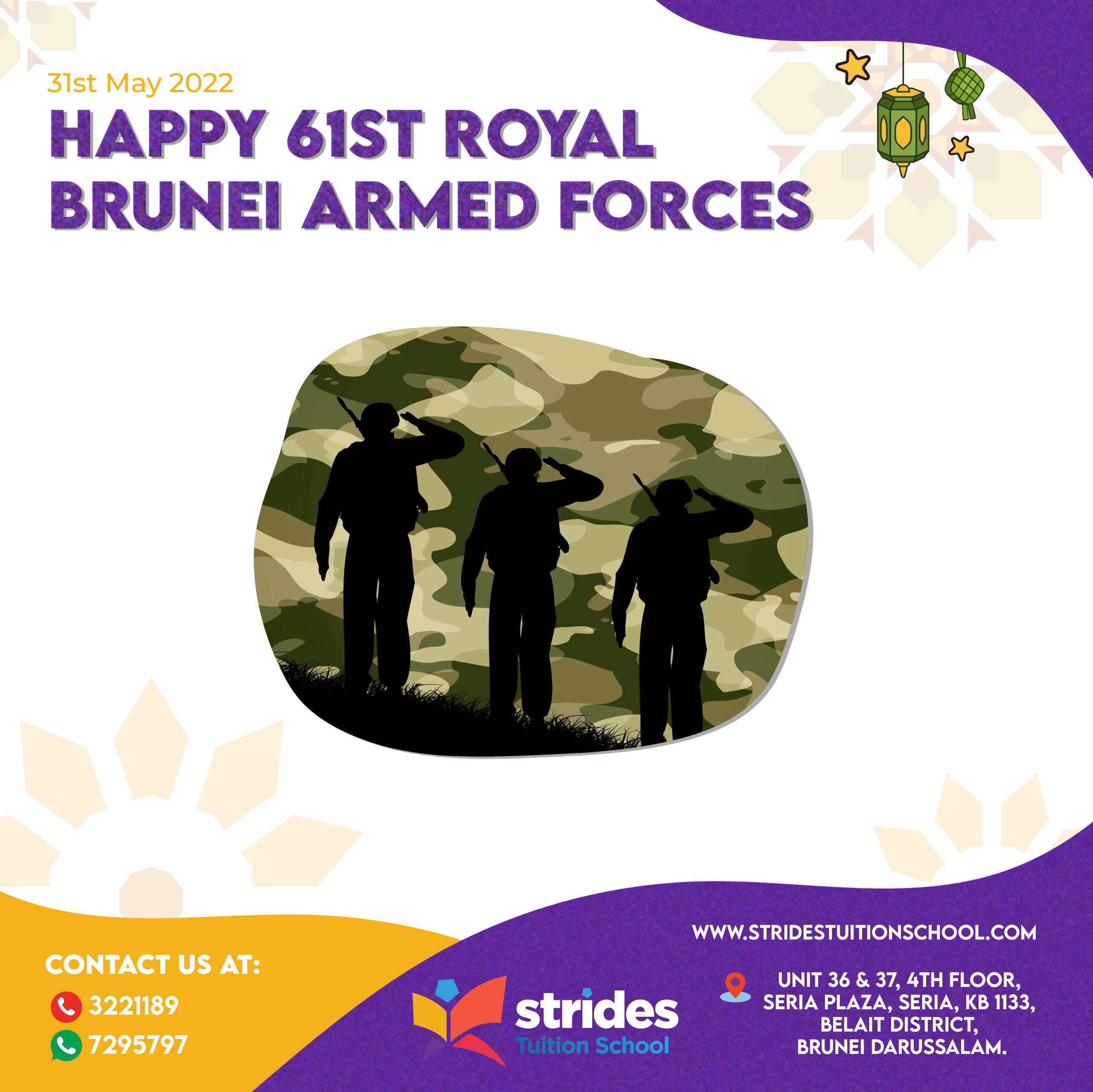 Strides Tuition School would like to wish a Happy 61st Anniversary to our Royal Brunei Armed Forces. Please take note that our tuition school will be closed on the 31st of May 2022 (Tuesday) and will resume on the 1st of June 2022 (Wednesday).
