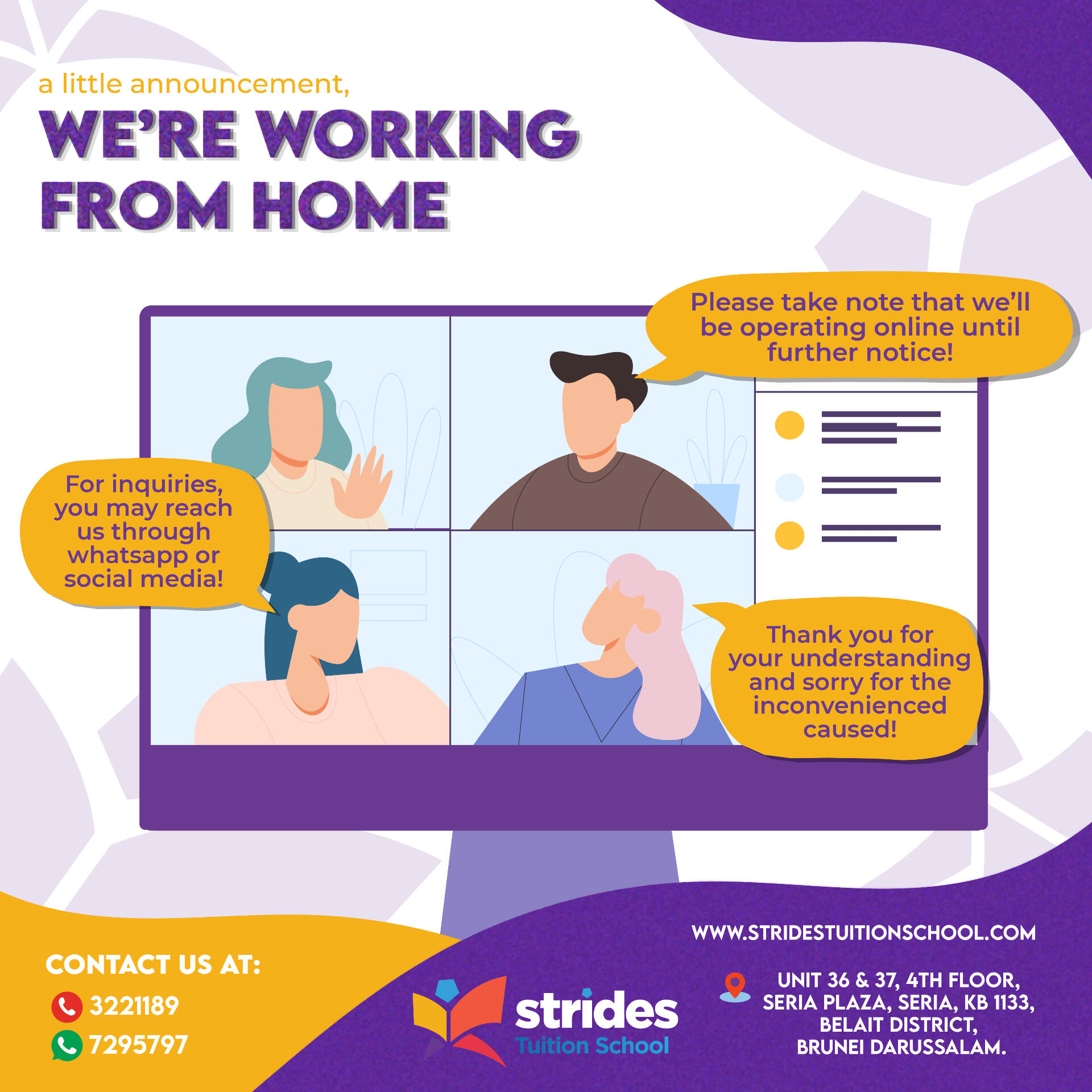 📢Dear parents and students, we would like to inform that Strides Tuition School will be working from home starting today until further notice in response to the increasing number of covid cases. For any inquiries, you may reach out to us via whatsapp or social media. Thank you for your understanding and we apologize for any inconvenience caused.