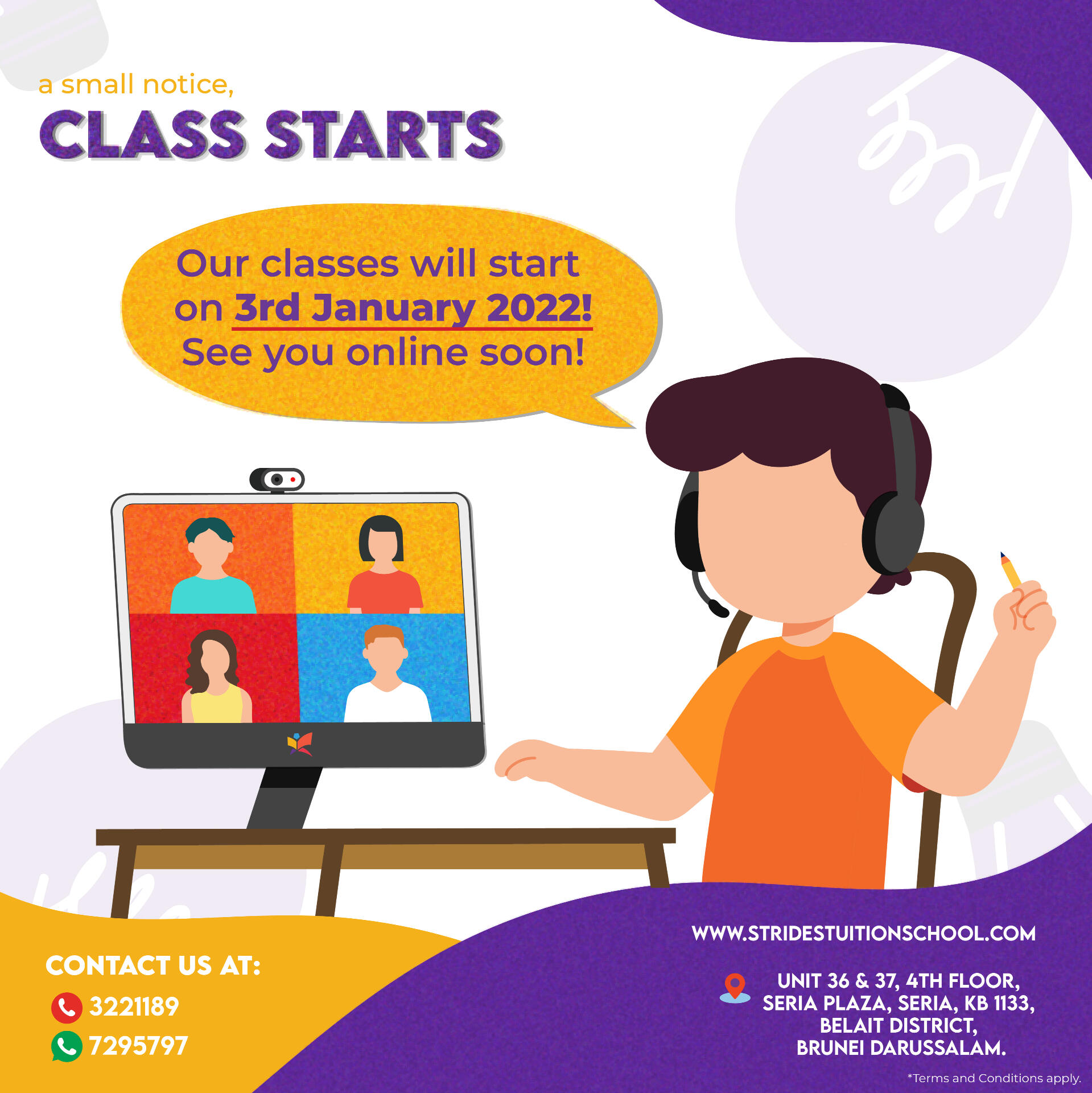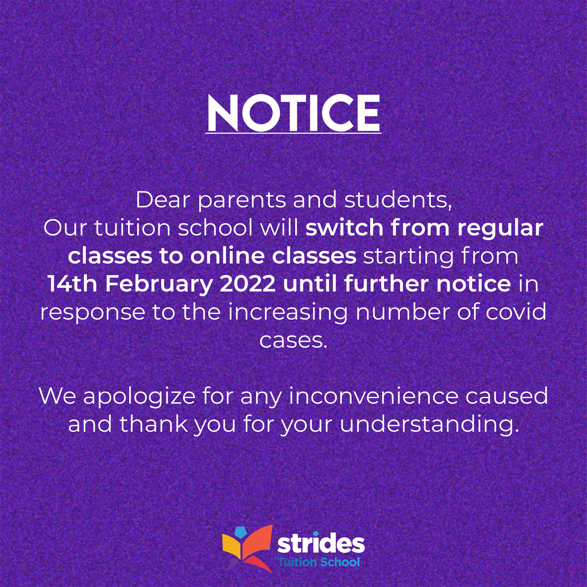 Please be informed that our tuition school will switch from regular classes to online classes starting from 14th February 2022 until further notice in response to the increasing number of covid cases.